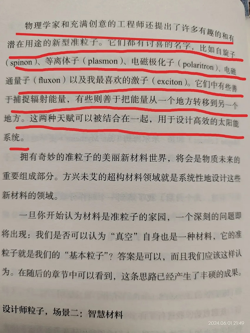 物理学家和充满创意的工程师还提出了许多有趣的和有潜在用途的新型准粒子。它们都有讨喜的名字,,比如自旋子等离体子(plasmon)、电磁极化子(polaritron)、电SD1nOn通量子(fuxon)以及我最喜欢的激子(exciton)。它们中有些善于捕捉辐射能量,有些则善于把能量从一个地方转移到另一个这两种天赋可以被结合在一起,用于设计高效的太阳能系统。