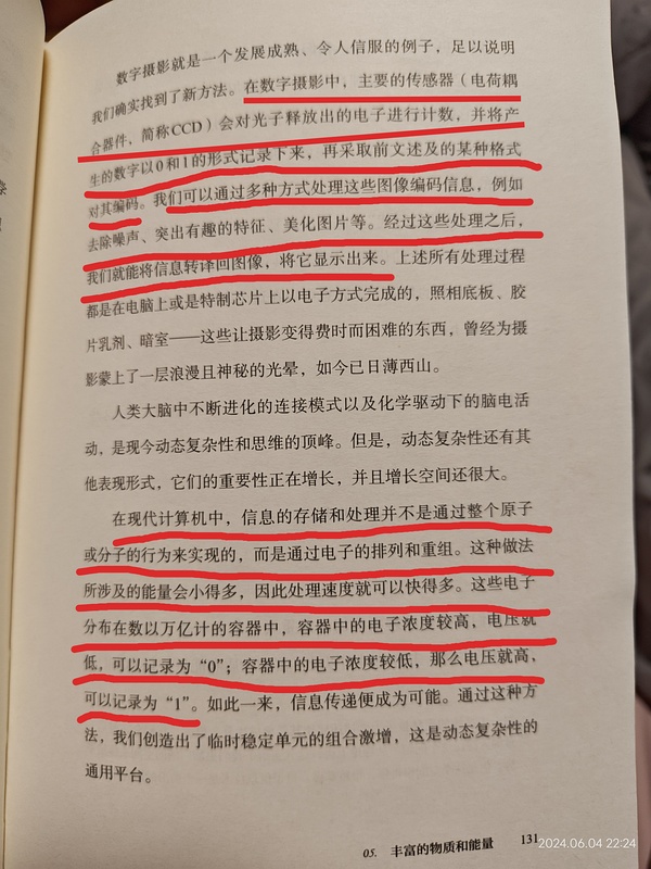 在数字摄影中,主要的传感器(电荷耦合器件,简称CCD)会对光子释放出的电子进行计数,并将产生的数字以0和1的形式记录下来,再采取前文述及的某种格式对其编码。我们可以通过多种方式处理这些图像编码信息,例如去除噪声、突出有趣的特征、美化图片等。经过这些处理之后,我们就能将信息转译回图像,将它显示出来。