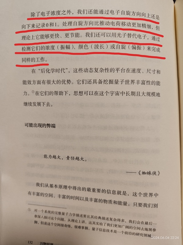 除了电子浓度之外,我们还能通过电子自旋方向向上还是向下来记录0和1。处理自旋方向比推动电荷移动更加精细,但理论上它能够更快、更节能。我们还可以用光子替代电子,通过检测它们的浓度(振幅)、颜色(波长)或自旋(偏振)来完成同样的工作。