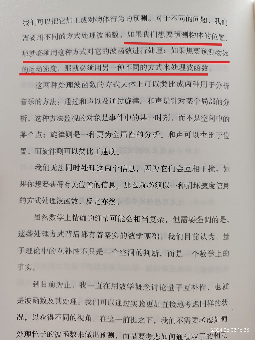 如果我们想要预测物体的位置,那就必须用这种方式对它的波函数进行处理;如果想要预测物体的运动速度,那就必须用另一种不同的方式来处理波函数。