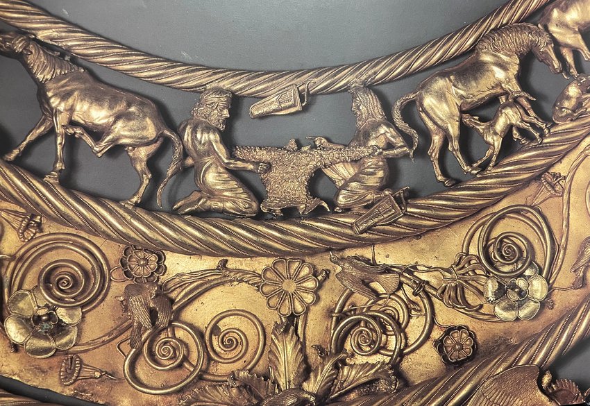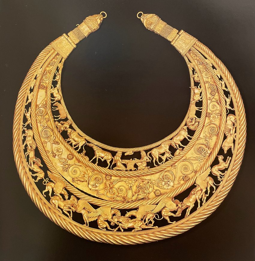 在斯基泰金器文物中,有一件三层胸饰令人尤为惊叹。这件金器于1971年出土于乌克兰南部,如今藏于基辅乌克兰历史珍宝博物馆。这件胸饰的年代约在公元前4世纪,曾为某位斯基泰王所佩戴,向我们提供了一个了解斯基泰人社会和经济结构的视角。它的中央部分刻画了两个下跪的蓄须斯基泰男子,手中捧着一件羊皮外套。考虑到整件胸饰由黄金制成,这个场景让人联想到阿耳戈英雄(Argonauts) 夺取金羊毛的故事,而金羊毛乃权威和君主身份的象征。在中央场景的右边和左边是一些家畜的图案,有马、母牛、绵羊和山羊。金饰上还有斯基泰奴隶的形象,其中一人为一头母牛挤奶,另一人则为一头母羊挤奶。这件胸饰清楚地显示,斯基泰社会的主体由草原战士构成,男性在其中占统治地位,其经济则有赖于畜牧业。