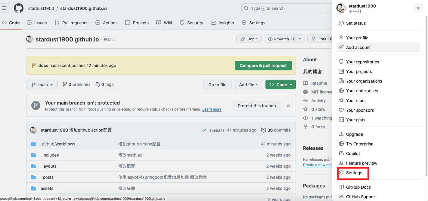上面使用JamesIves/github-pages-deploy-action@v4.5.0 替换 actions/jekyll-build-pages@v1 就是为了将_site目录保存到了docs分支