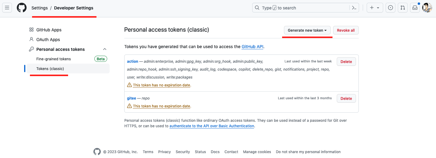登陆github后点击又上角头像->Settings->Developer setings->Personal access tokens->Tokens(classic)