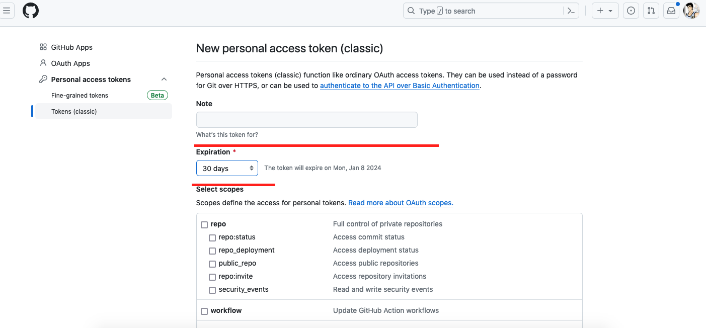 在note中取个名字,选过期时间,我选的永不过期,下面的授权主要把repo和workflow勾上,我为了保险都给勾上了…