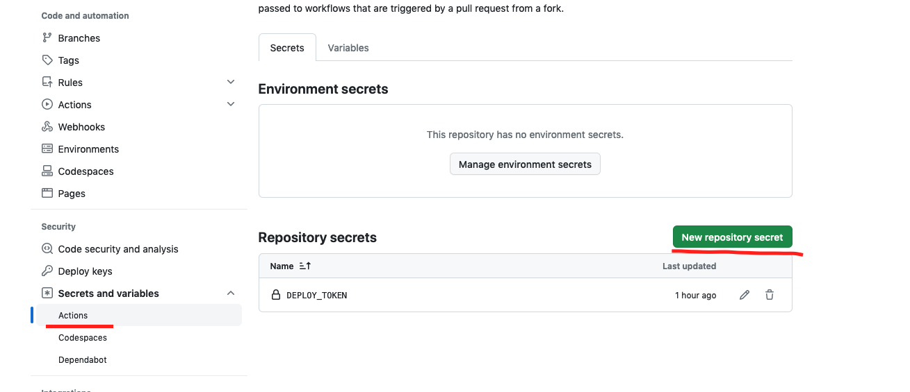 名字填:DEPLOY_TOKEN secret:填上一步生成的gh开头的字符串 保存。