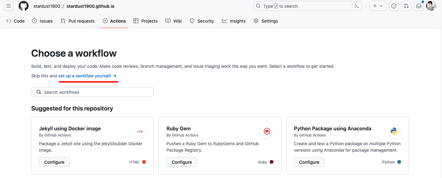 回到仓库,点击action,点new workflow,然后点set a workflow yourself