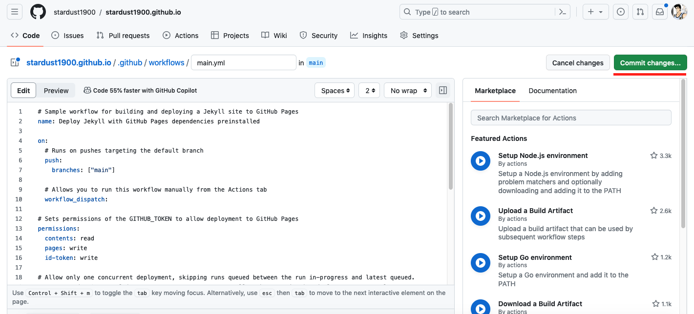 把下面的内容拷贝进去,保存 commit changes。github的部分就搞完了