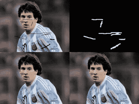 上面messi_2.jpg是需要修复的图片,而mask2.png是掩模图片,这张图片的作用是指定图片损坏的位置,该图片只有黑白两色,白色就是损坏的地方。掩模图片和原图的大小(即宽高)必须完全一致,否则会报错。